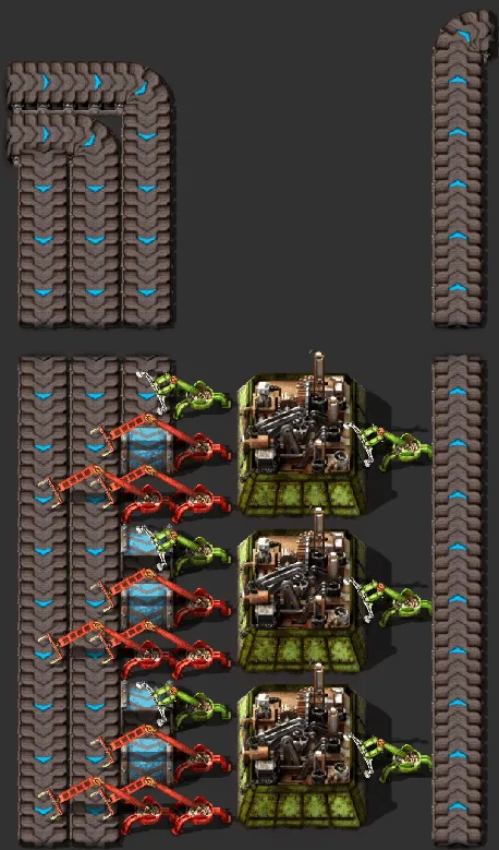 Let’s call the upper horizontal belts the local bus. Note that the Assemblers can be unlimitedly expanded (If you don’t consider belt throughput).