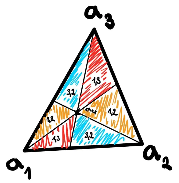 Vezmeme tedy jeden a postavíme 6 částí jako na obrázku. Podle toho v jaké části leží vybereme zbývající dva vrcholy trojúhelníku společně s a máme hotovo. opět nemůže ležet mezi částmi, kvůli obecné poloze.