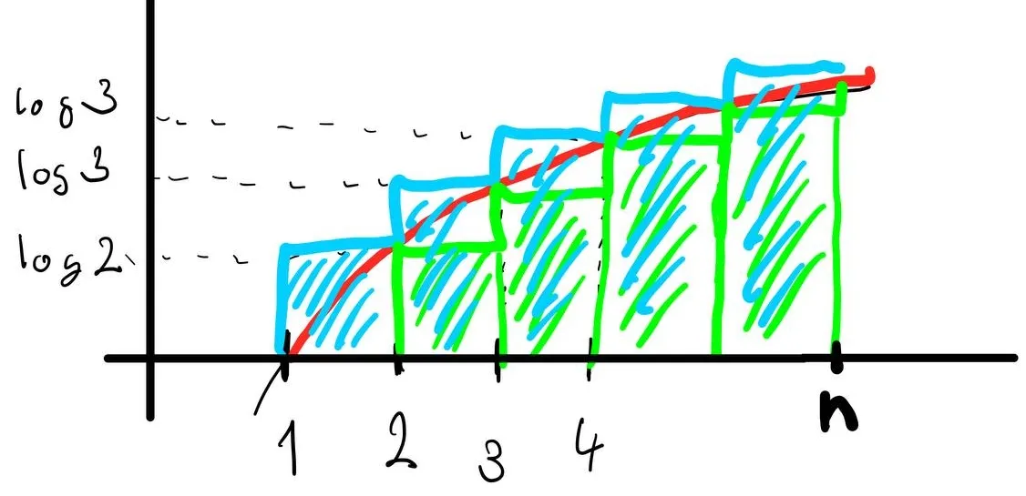 K dokázání horního odhadu nám pomůže zelená část. Je vlastně stejná jako ta modrá, akorát je posunutá doprava. Pokud budeme porovnávat její hodnotu s červenou částí, tak červená bude větší, musíme ji ale také posunout. Integrál bude tedy od do